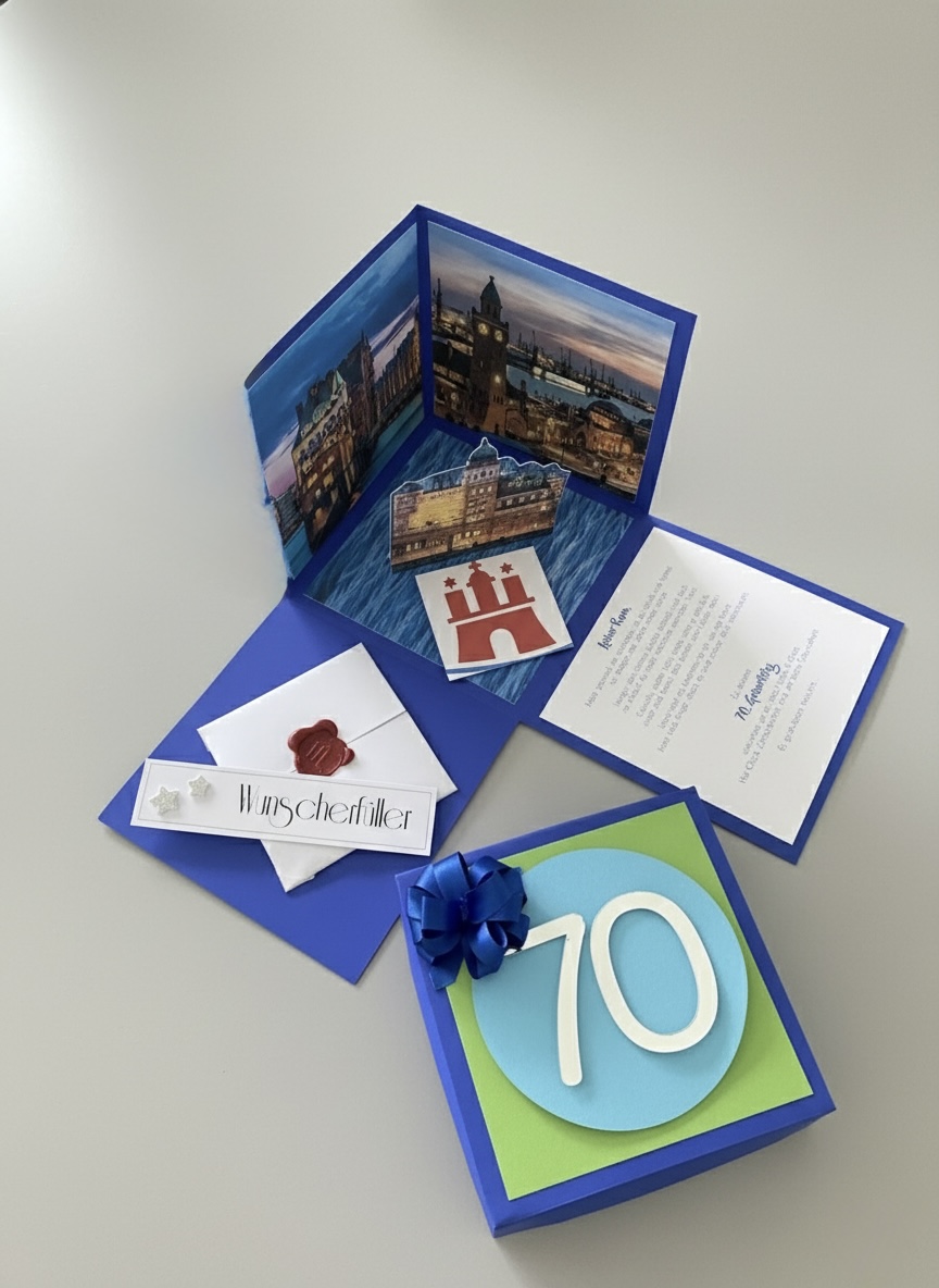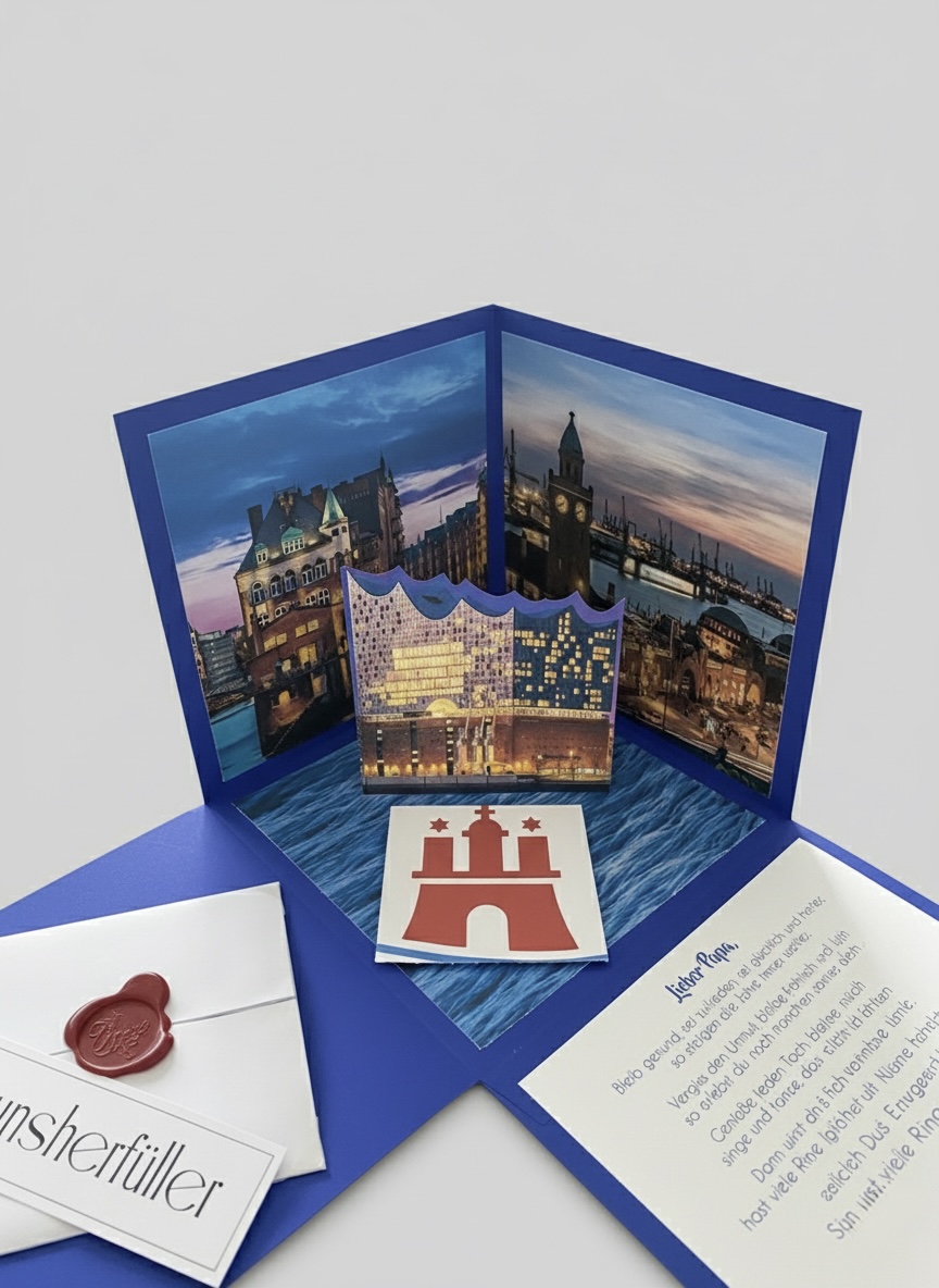 Diese aufwendig gestaltete Explosionsbox ist die ideale Verpackung für einen Hotelgutschein, eine Städtereise oder ein Musical-Wochenende in Hamburg. Beim Öffnen des Deckels entfaltet sich ein beeindruckendes 3D-Panorama mit den Wahrzeichen der Stadt – von der Speicherstadt bis zur Elbphilharmonie. Ein Muss für alle, die den Norden lieben.