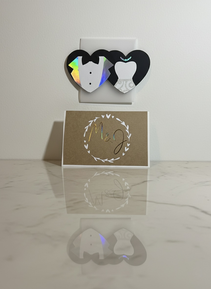 Design: Zwei 3D-Brautpaar-Herzen mit Initialen auf der Vorderseite.