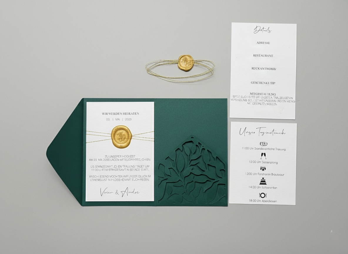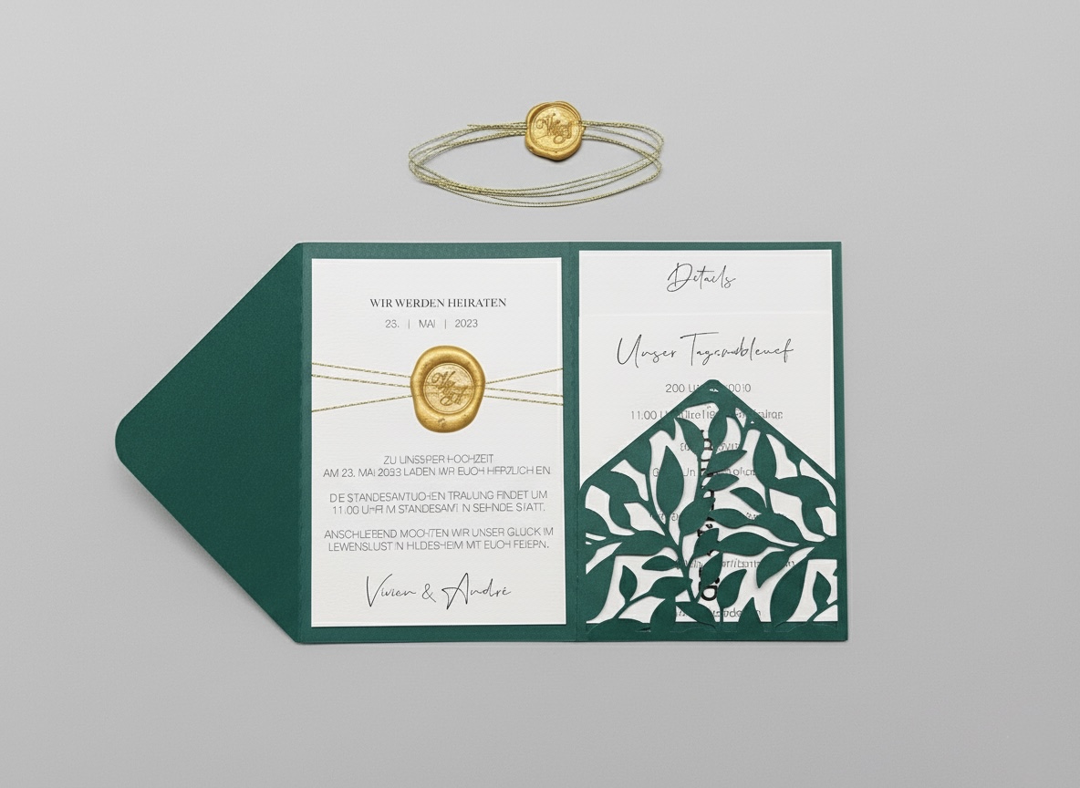 Ein Meisterstück für den wichtigsten Tag eures Lebens. Diese Einladung setzt neue Maßstäbe in Sachen Exklusivität. Der dreiteilige Folder in edlem Waldgrün umschließt eure Hochzeitsdetails wie ein kostbares Geschenk. Das absolute Highlight ist das integrierte Fach mit einem filigranen Blätter-Motiv, das präzise mit dem Schneidplotter ausgearbeitet wurde. In diesem Fach finden eure Zusatzkarten (wie Ablauf oder Anfahrt) stilvoll ihren Platz. Zusammengehalten wird dieses Kunstwerk von einer feinen Goldkordel und einem handgesetzten, goldenen Wachssiegel.