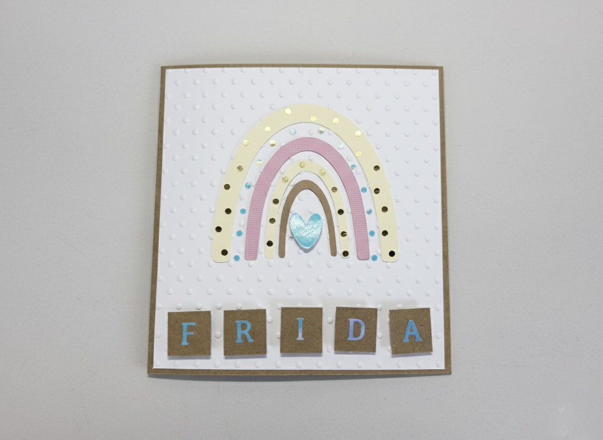 Ein buntes Willkommen für ein kleines Wunder. Diese Karte ist so besonders wie der Schützling, für den sie bestimmt ist. Der fröhliche Regenbogen wurde detailreich aus verschiedenen Vinyl-Schichten zusammengesetzt – inklusive unzähliger, handgesetzter goldener Pünktchen, die wie kleiner Sternenstaub wirken. Das absolute Highlight ist das Herz in der Mitte aus holographischem Vinyl, das je nach Lichteinfall magisch von Rosa über Lila bis Hellblau schimmert.
